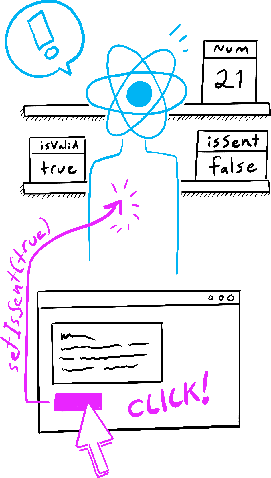 import { useState } from 'react'; export default function Form() { const [isSent, setIsSent] = useState(false); const [message, setMessage] = useState('Hi!'); if (isSent) { return <h1>Your message is on its way!</h1> } return ( <form onSubmit={(e) => { e.preventDefault(); setIsSent(true); sendMessage(message); }}> <textarea placeholder="Message" value={message} onChange={e => setMessage(e.target.value)} /> <button type="submit">Send</button> </form> ); } function sendMessage(message) { // ... }